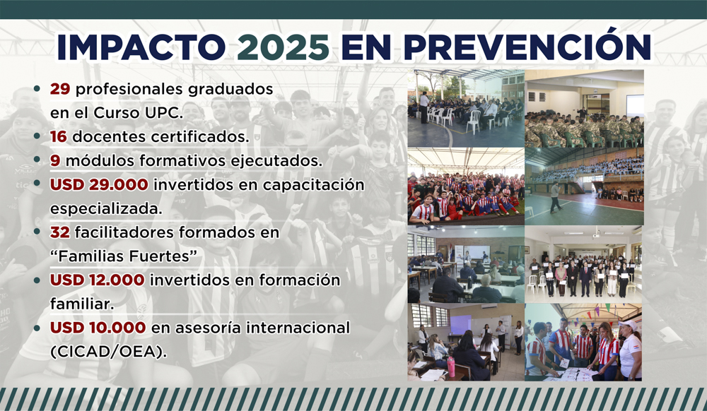 Uno de los hitos más relevantes es el Curso Currículum Universal de Prevención (UPC) para Coordinadores de Programas de Prevención, desarrollado en el marco del Plan Colombo – Réplica Paraguay. Este proceso formativo permitió la graduación de 29 profesionales, provenientes de municipios del Departamento de Cordillera, instituciones educativas, fuerzas de seguridad, sector salud, universidades y organizaciones civiles, fortaleciendo una red intersectorial clave para la prevención del consumo de drogas. El curso fue ejecutado por docentes certificados, con monitoreo continuo del Plan Colombo Internacional y contó con evaluación internacional y gestión de certificación oficial.