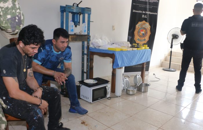 Durante la intervención detuvieron a dos hombres identificados como Aníbal Giménez Sosa(37), responsable de la carga de cocaína y Jorge Fabián Rodríguez Ruiz (34) – supuesto químico o “cocinero” encargado del procesamiento artesanal.