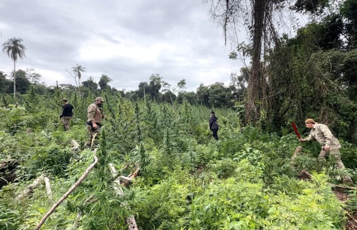 El procedimiento fue ejecutado en la Colonia Mbarete, tras tareas investigativas que detectaron la utilización irregular de una reserva forestal para el cultivo de drogas. En el lugar, los intervinientes acompañados por el Fiscal Elvio Aguilera, constataron una extensa superficie destinada a la producción ilícita.