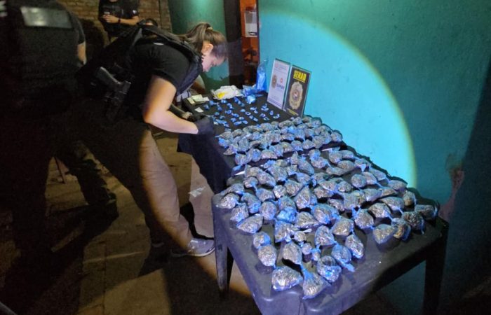 En el marco de acciones focalizadas para la protección de comunidades educativas, Agentes Especiales de la Dirección de Operaciones Urbanas de la SENAD ejecutaron dos allanamientos simultáneos en el barrio General Díaz de la ciudad de Arroyos y Esteros, desarticulando una estructura que operaba con dos focos de distribución de drogas al menudeo en inmediaciones de un importante centro educativo.